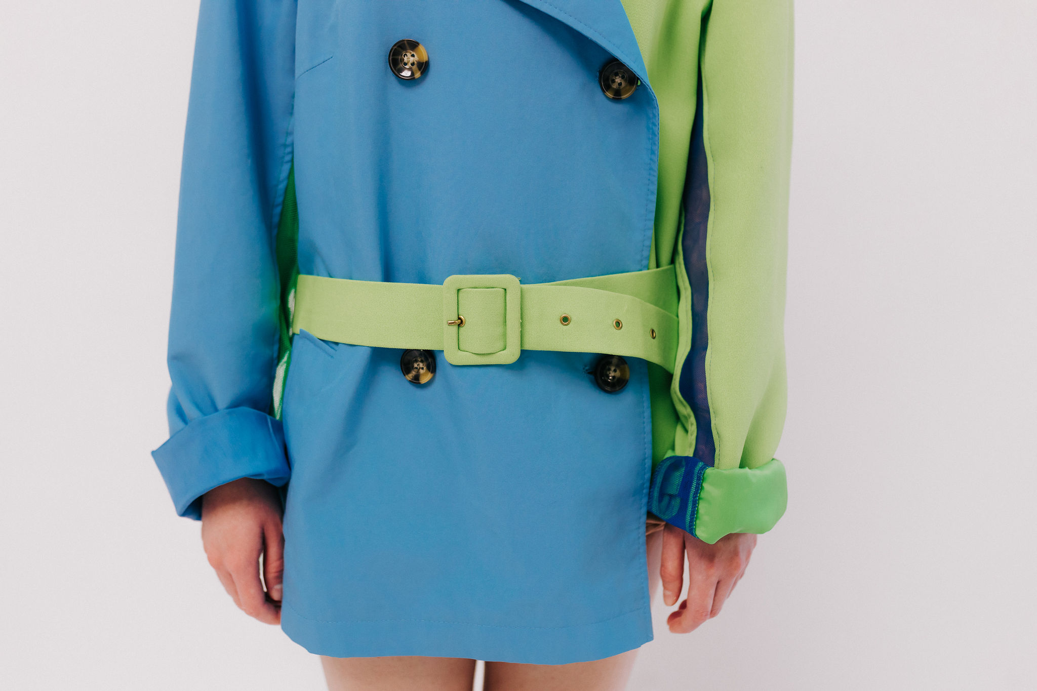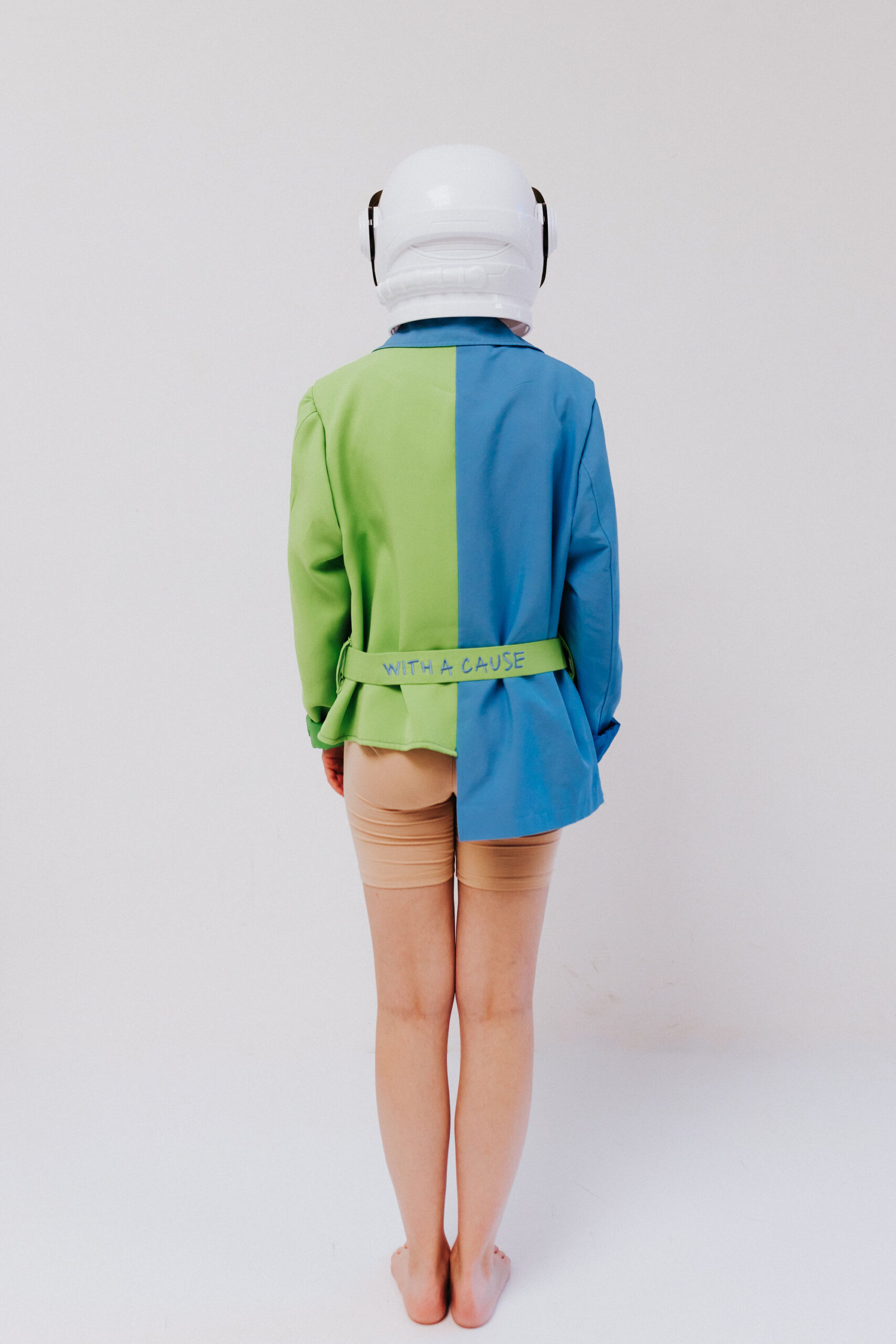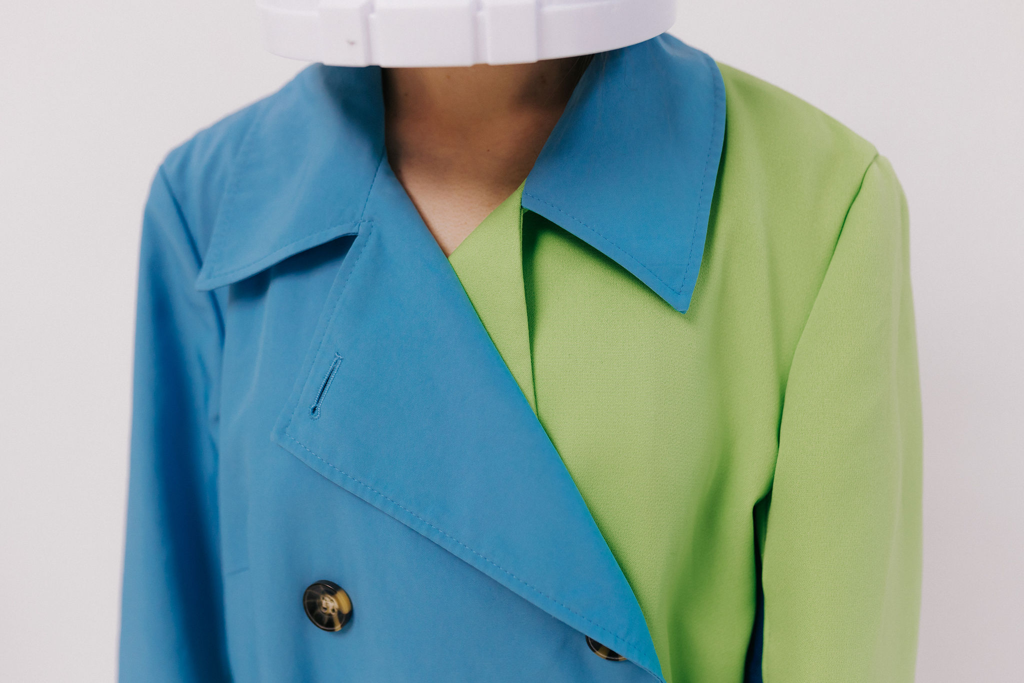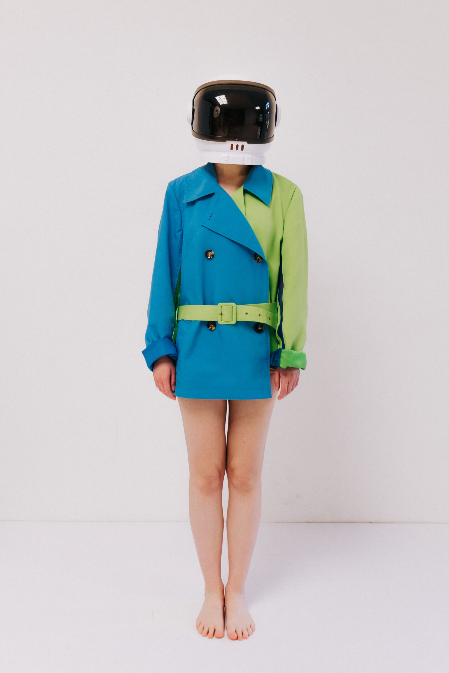 Két félbevágott kabát találkozásából született, tüll részletekkel az oldalán és az ujjaknál. Az első zöld rész rövidebb kialakítása, hátul pedig a kék töri meg az egyhangúságot.
