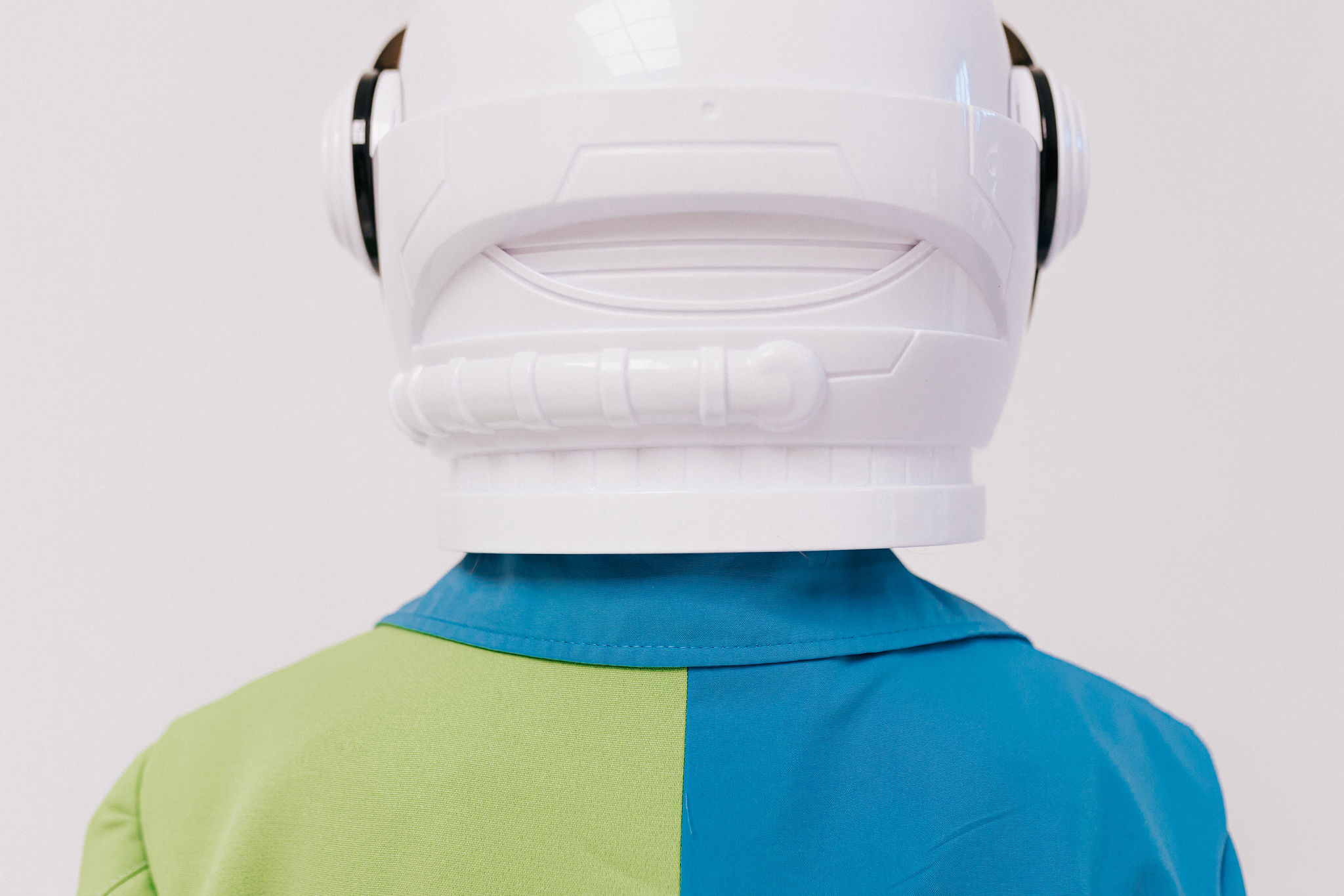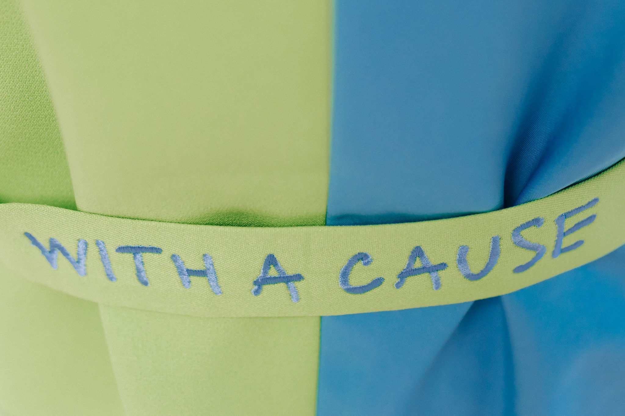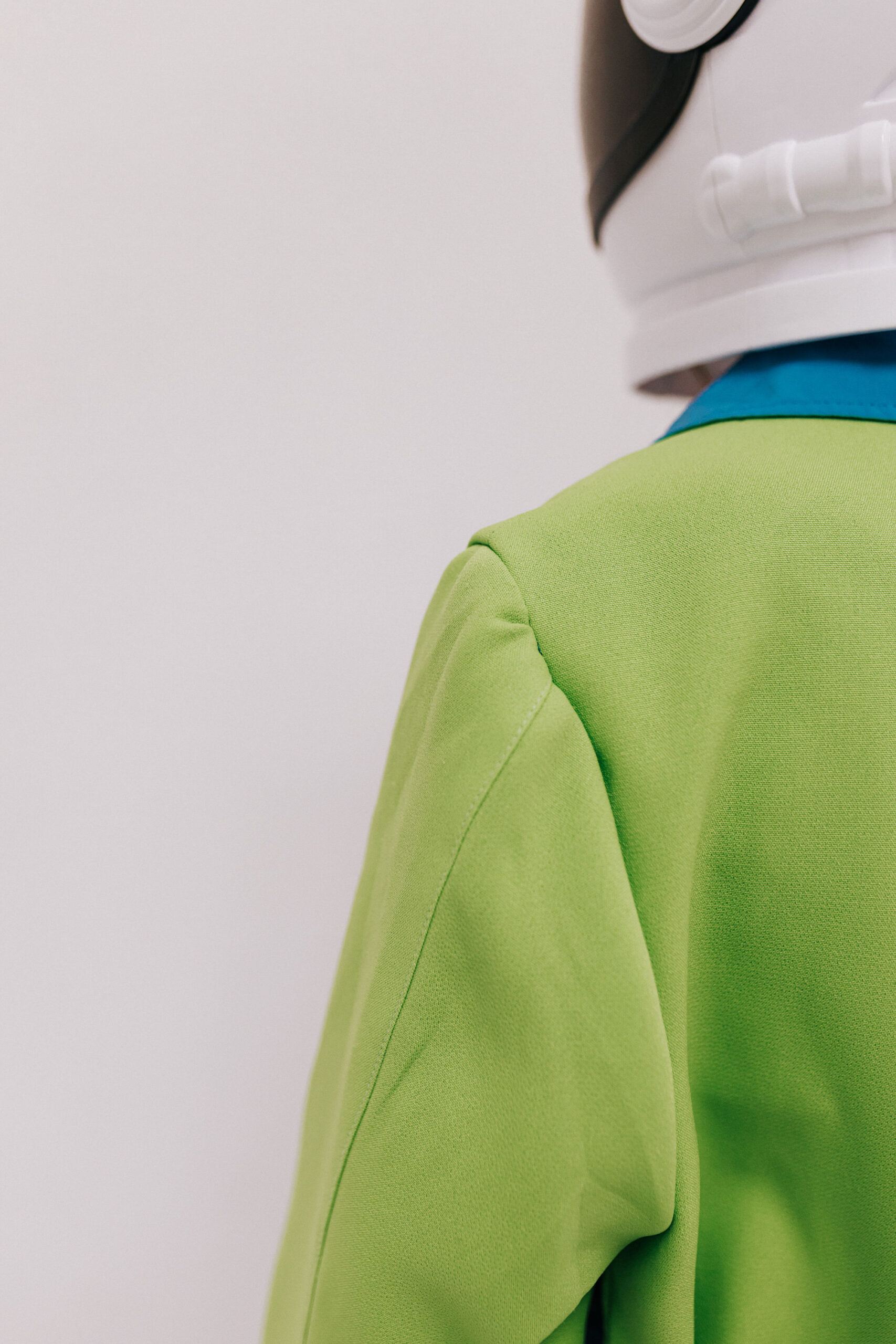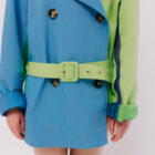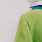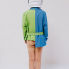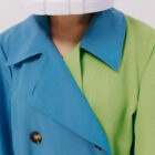 Két félbevágott kabát találkozásából született, tüll részletekkel az oldalán és az ujjaknál. Az első zöld rész rövidebb kialakítása, hátul pedig a kék töri meg az egyhangúságot.