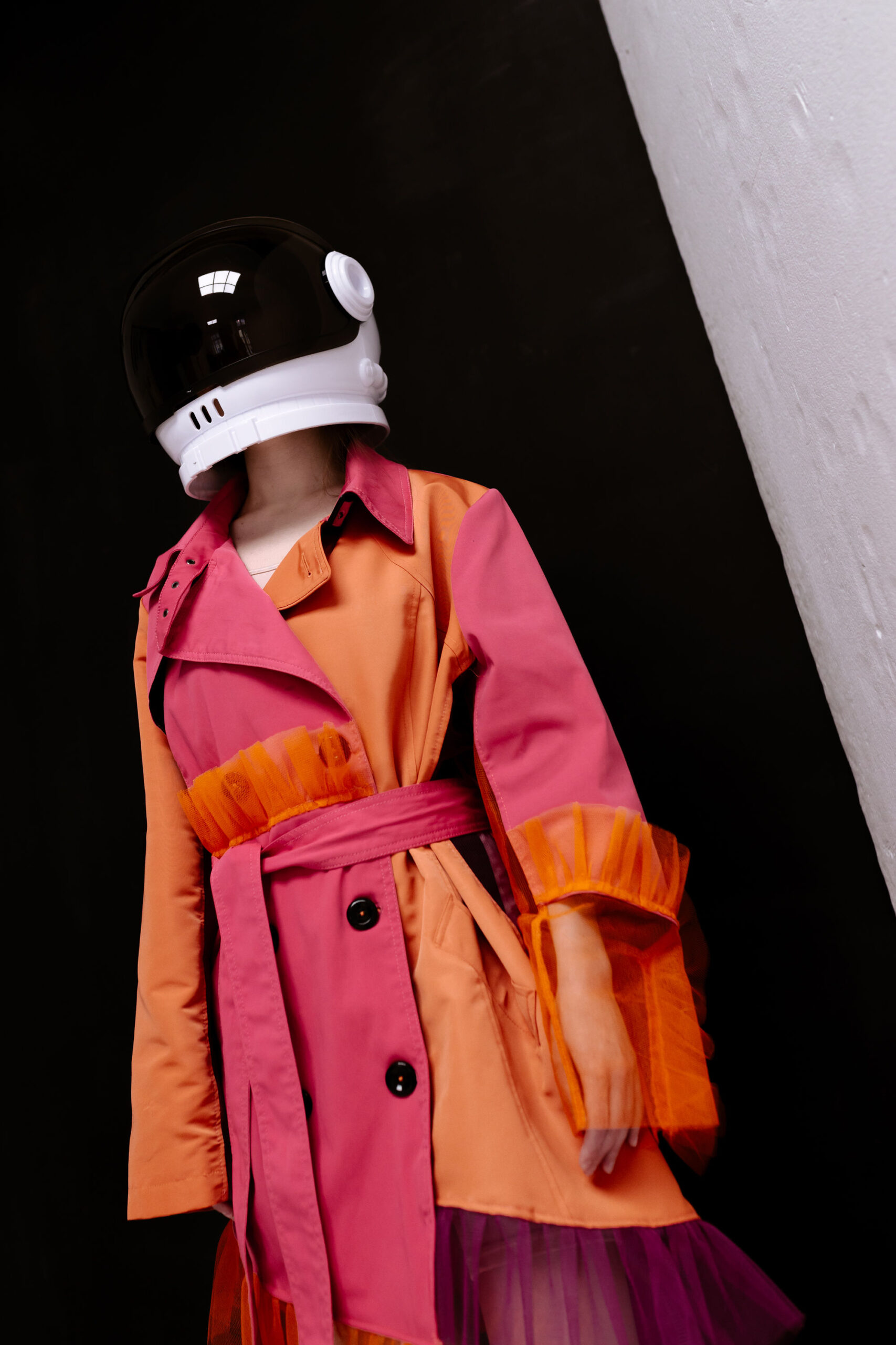 A kabát elején a hosszabb rövidebb megoldás visszaköszön, mint a kollekció többi darabján is látható. A kabát alja tüllel végződik, a derékrészen egy övpánt fölött pedig tüll fodor töri meg a kabát vonalát. A bal ujján a csuklónál egy áttetsző tüll betét kapott helyet, fodorral körbe ölelve.
